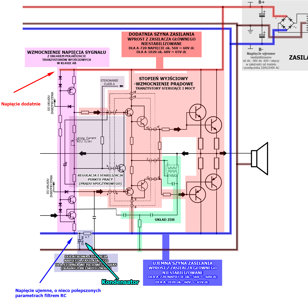 Ogólnie, proponowane przeze mnie rozwiązanie z powodzeniem może być stosowane w większości wzmacniaczy analogowych klasy AB od tzw. Unitry po „worki monet”;-), natomiast ja dopracowałem je pod kątem Yamahy A-720/A-1020, w taki sposób, by stanowiło spójną całość i rozwinięcie poprzednich modyfikacji, oczywiście z zachowaniem oryginalnego układu wzmocnienia napięcia i pełnej funkcjonalności wzmacniacza.