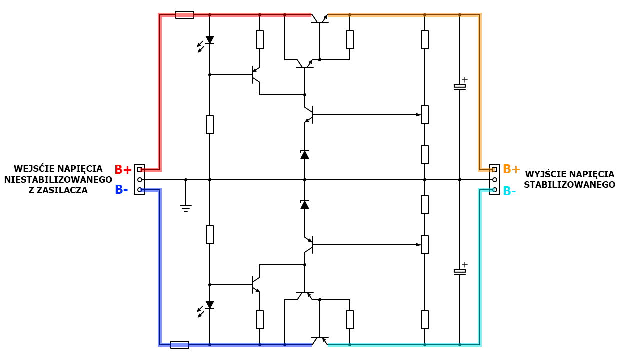 Moja koncepcja w tym zakresie, opiera się na zastosowaniu tranzystorowego układu stabilizacji napięcia z kompensacją i źródłem prądowym w celu poprawy jego parametrów, dla obu napięć zasilających. Poniżej jego schemat ogólny dla napięć symetrycznych, zbliżony do finalnej wersji jaką po testach i pomiarach zastosowałem u siebie: