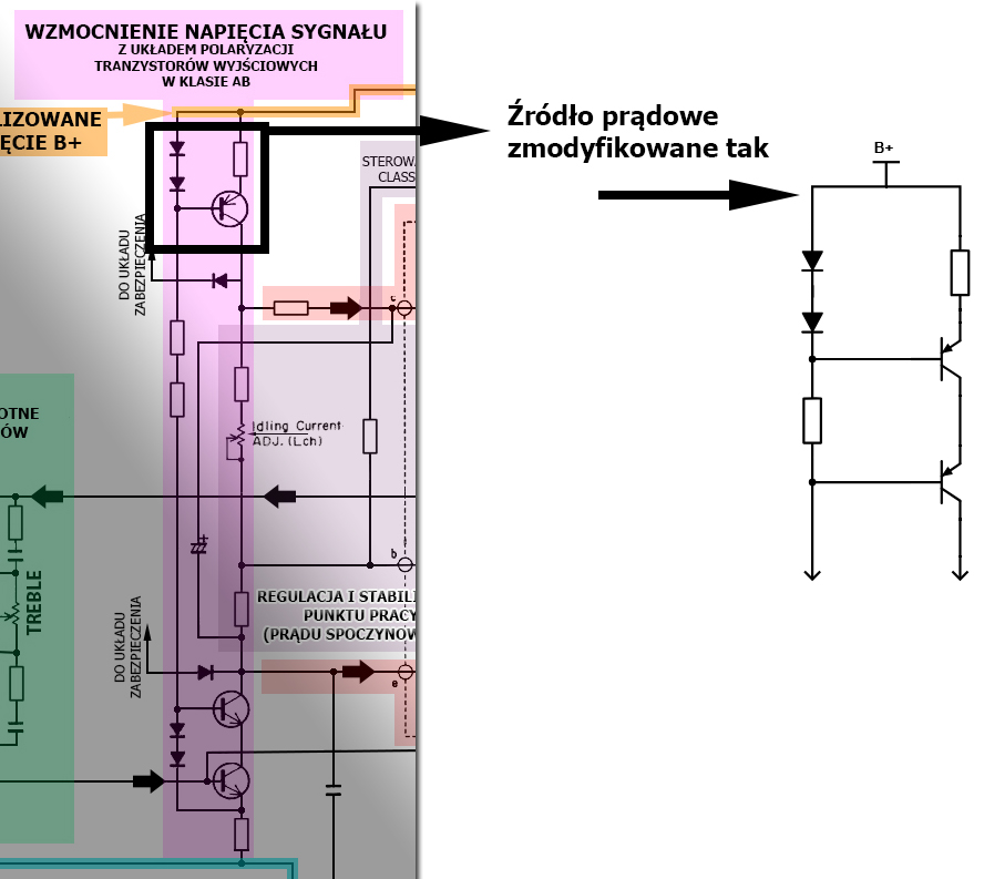 Na poniższym schemacie końcówki mocy w moim opracowaniu, widać gdzie i jak, powyższy układ stabilizacji został wpięty we wzmacniacz: