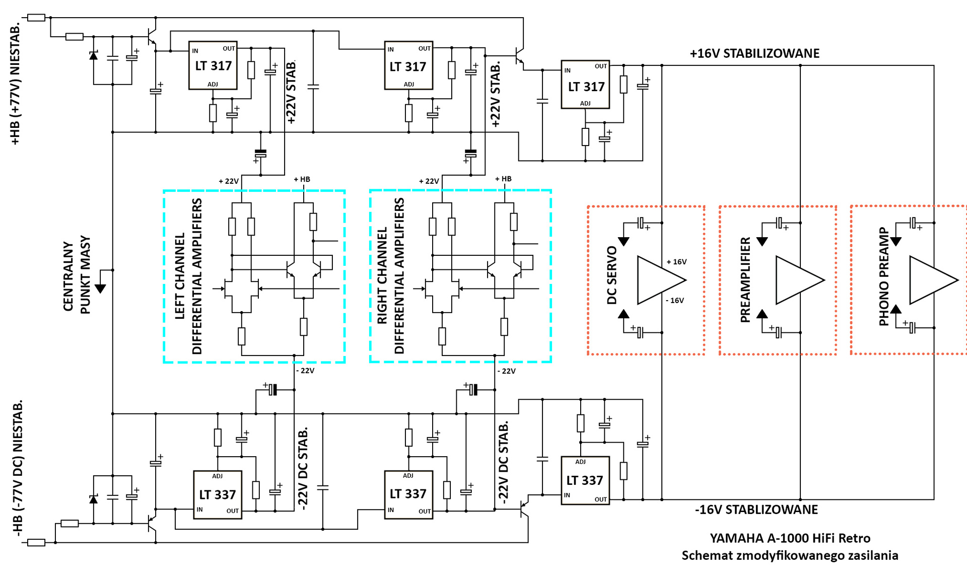 Jak widać, generalnie polega na wykorzystaniu typowego, od wielu lat znanego, regulowanego stabilizatora liniowego typu lm317/337, jednak w wersji ulepszonej LT317/337, poprzedzonego układem stabilizacji wstępnej, oraz wyposażenia obu w elementy dodatkowe, znacznie poprawiające jego parametry, oraz kolejnego stopnia zasilającego przedwzmacniacze i układ dc servo.