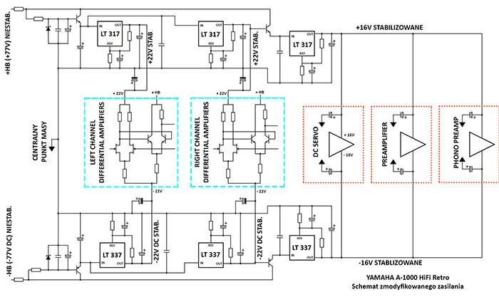 W moim rozwiązaniu napięcie pobierane jest dokładnie z tej samej linii co w oryginalnym wzmacniaczu. Jest to zrobione celowo przez inżynierów Yamahy, bo sekcje niskonapięciowe do pewnej mocy z jaką gramy, jest odseparowane od sekcji prądowych i mniej na siebie wpływają.