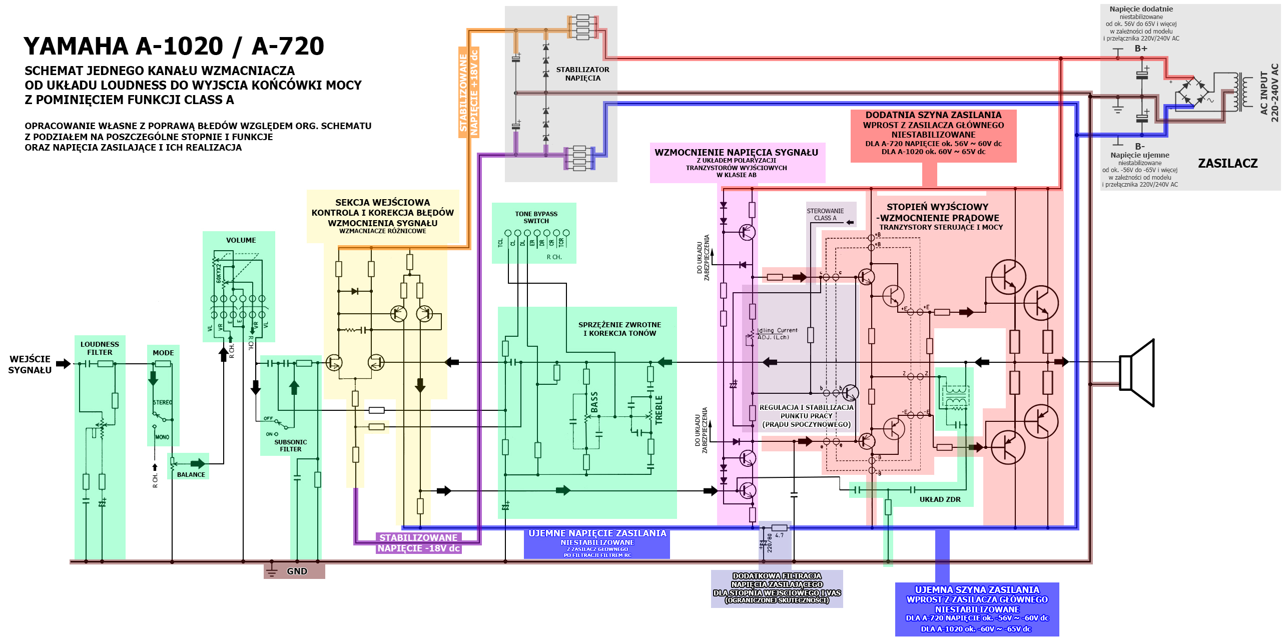 Ogólnie, proponowane przeze mnie rozwiązanie z powodzeniem może być stosowane w większości wzmacniaczy analogowych klasy AB od tzw. Unitry po „worki monet”;-), natomiast ja dopracowałem je pod kątem Yamahy A-720/A-1020, w taki sposób, by stanowiło spójną całość i rozwinięcie poprzednich modyfikacji, oczywiście z zachowaniem oryginalnego układu wzmocnienia napięcia i pełnej funkcjonalności wzmacniacza.