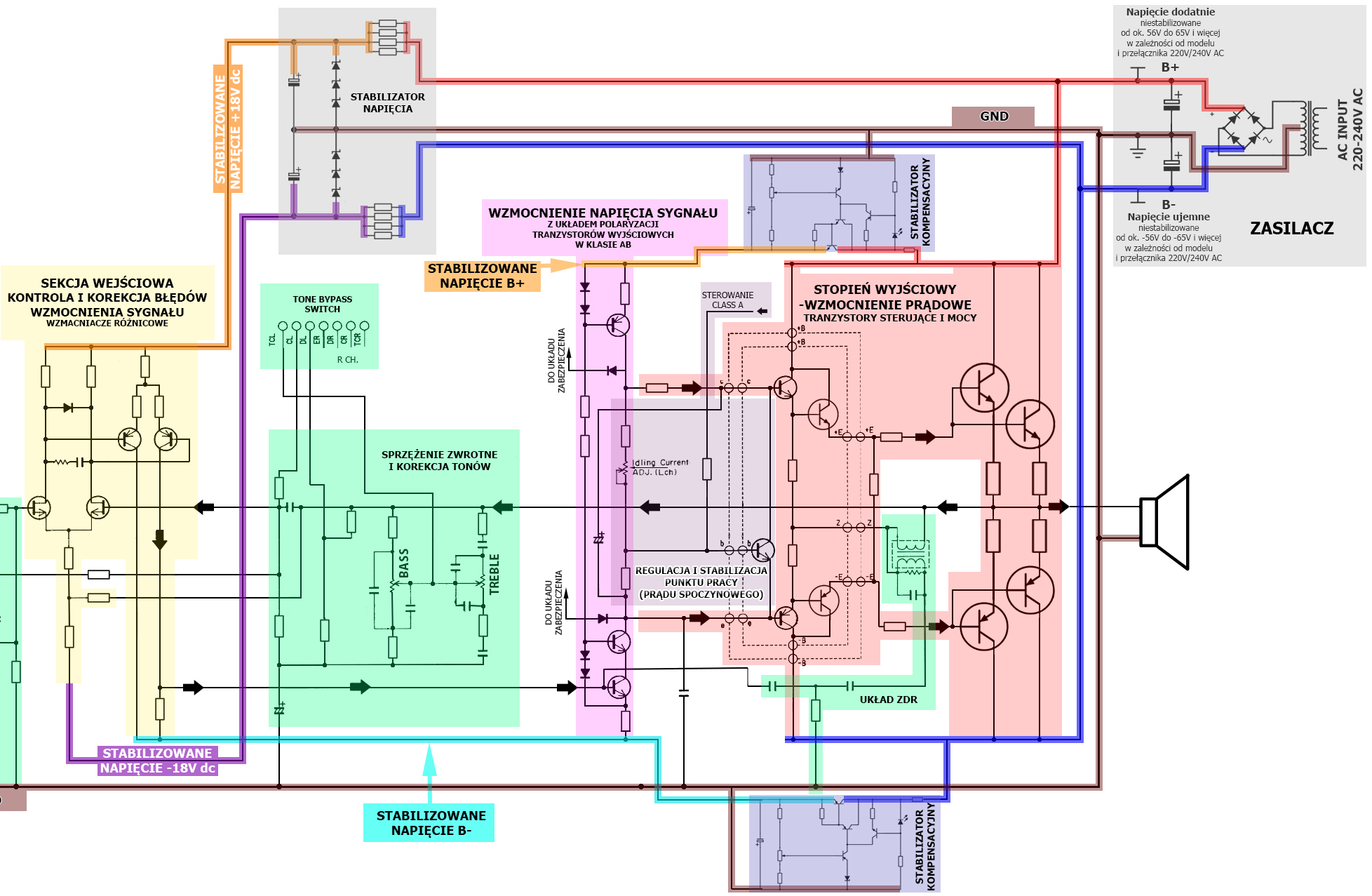 Na poniższym schemacie końcówki mocy w moim opracowaniu, widać gdzie i jak, powyższy układ stabilizacji został wpięty we wzmacniacz: