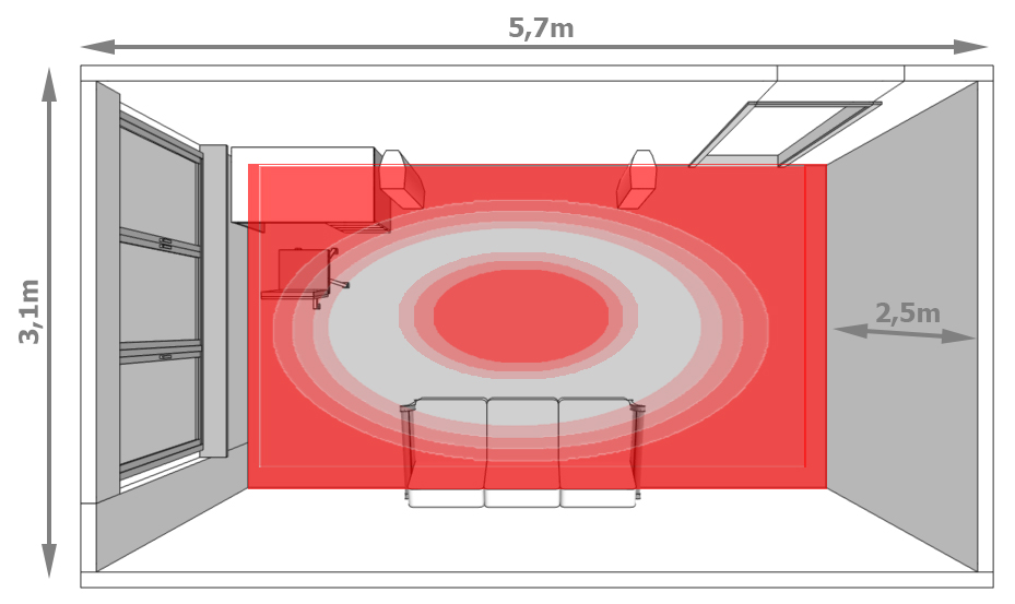 Przybliżone, dobre natężenie tonów niskich na środku pokoju, ma miejsce blisko podłogi oraz w pozycji stojącej (na wysokości uszu siedzącego słuchacza jest nazwijmy to „dziura”). Obszar zewnętrzny wyraża natężenie tonów niskich na wysokości siedzącego słuchacza.
